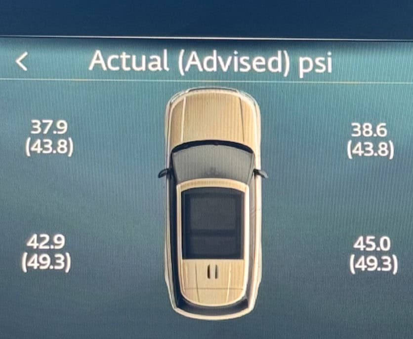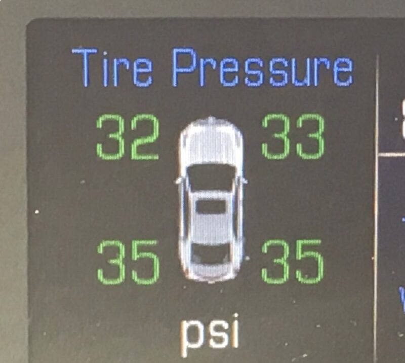 Now, the car does display a special warning if any tire is so underinflated that it might be dangerous. We wouldn't want an annoying alarm every time the front pressure hit 31 or 33 psi. There's always some variation, and there's no problem caused by being a little bit off from the desired number.