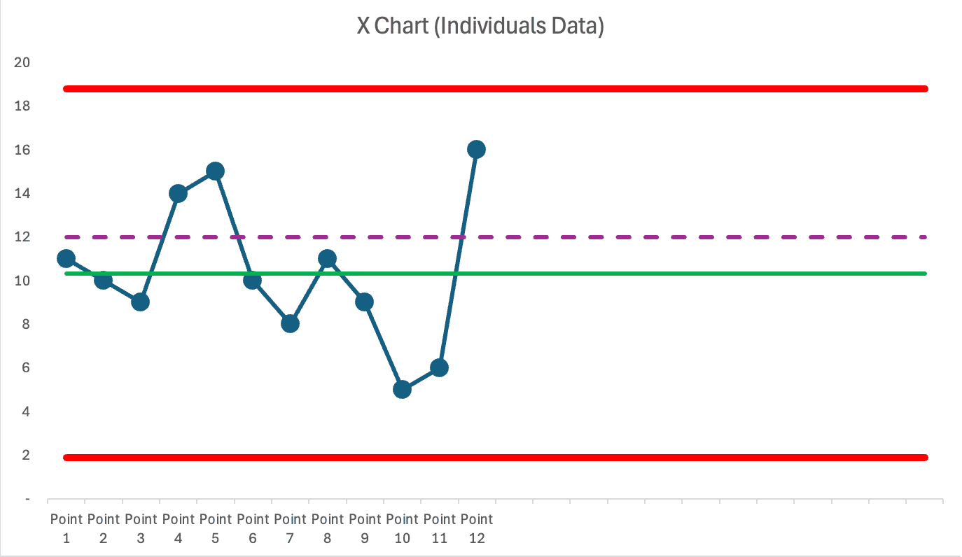 And, as I wrote about the other day, the Process Behavior Chart methodology shows us that every single one of those 12 data points are “noise.” In more technical terms, it's all “common cause variation.”