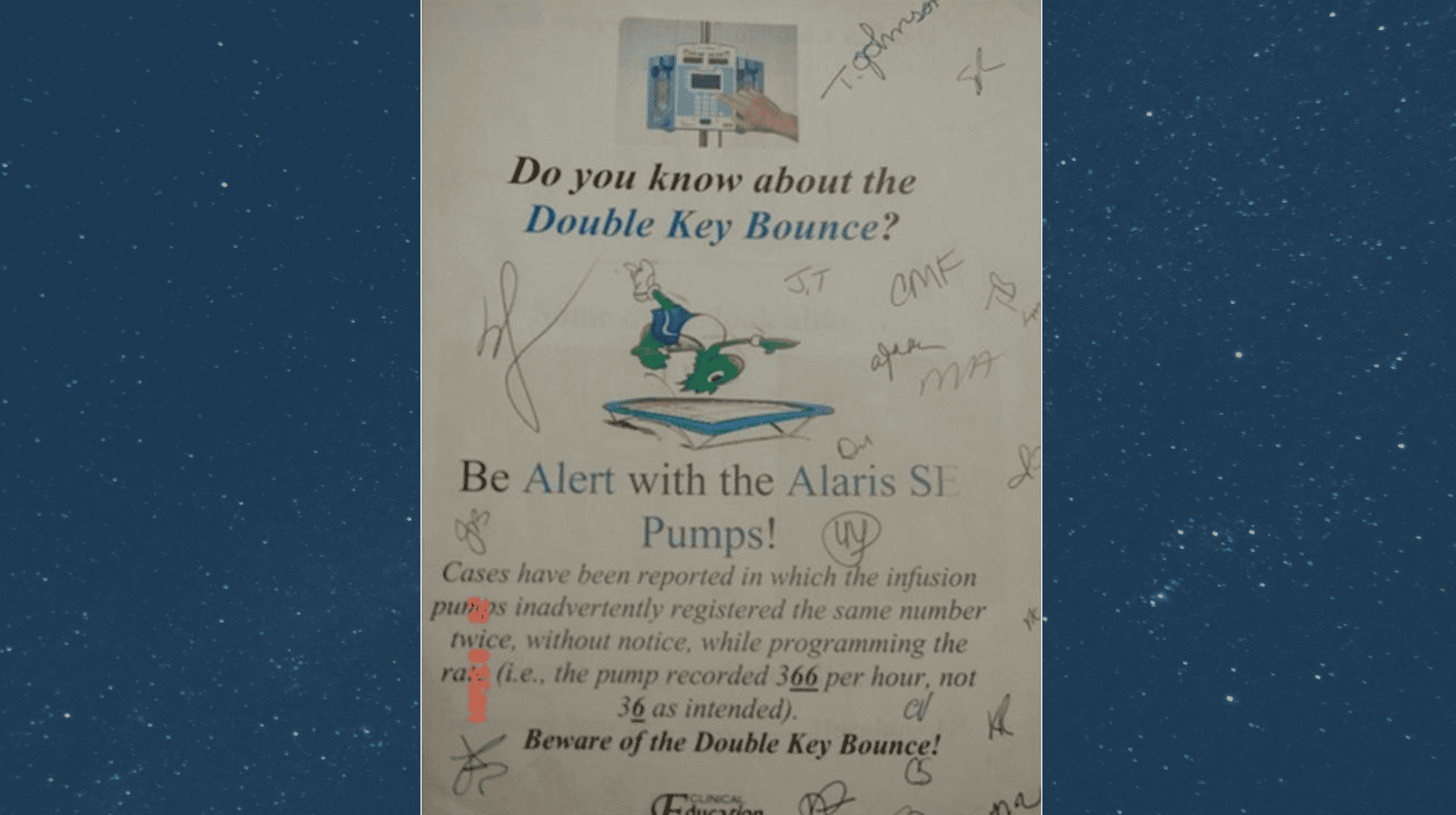 And then there was the infusion pump with a “double key bounce” problem — nurses would type 36 as a rate and the pump would record 366. The hospital's response was to put up a sign and have nurses initial it, promising not to make the mistake. That's not fair to the nurses. We can do better. We MUST do better.