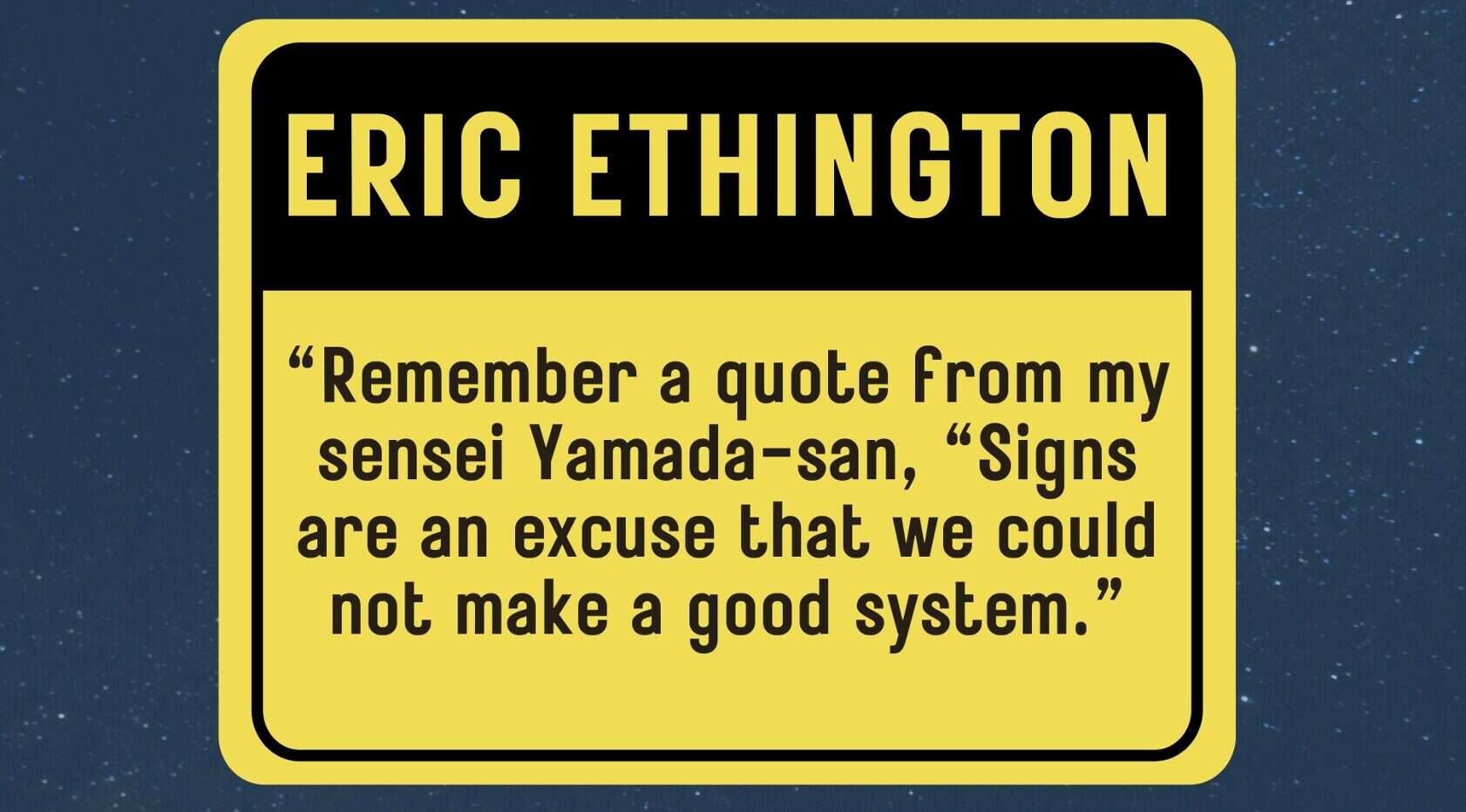 I shared a quote from my friend Eric Ethington in the Lean world, who recalled his sensei Yamada saying that signs are an excuse that we could not make a good system. That's a pretty good way to frame it.