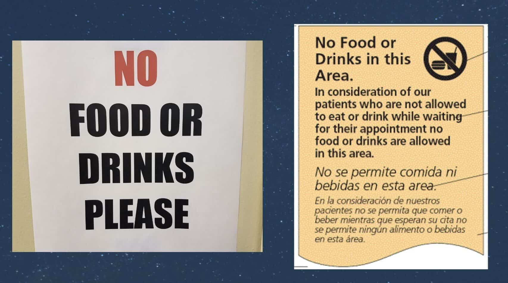I don't want to be too harsh about signs. Sometimes they really are the best countermeasure available in the moment. One children's hospital had a sign in the MRI waiting area that said “No food or drinks.” Kids who couldn't eat before sedation were in the same room with people eating McDonald's, and little kids being little kids, they'd grab someone's fries. The team improved the sign — made it bilingual, explained the why, and moved it to the door so people would see it before entering. Short of posting a security guard, a better sign was actually the right answer there.