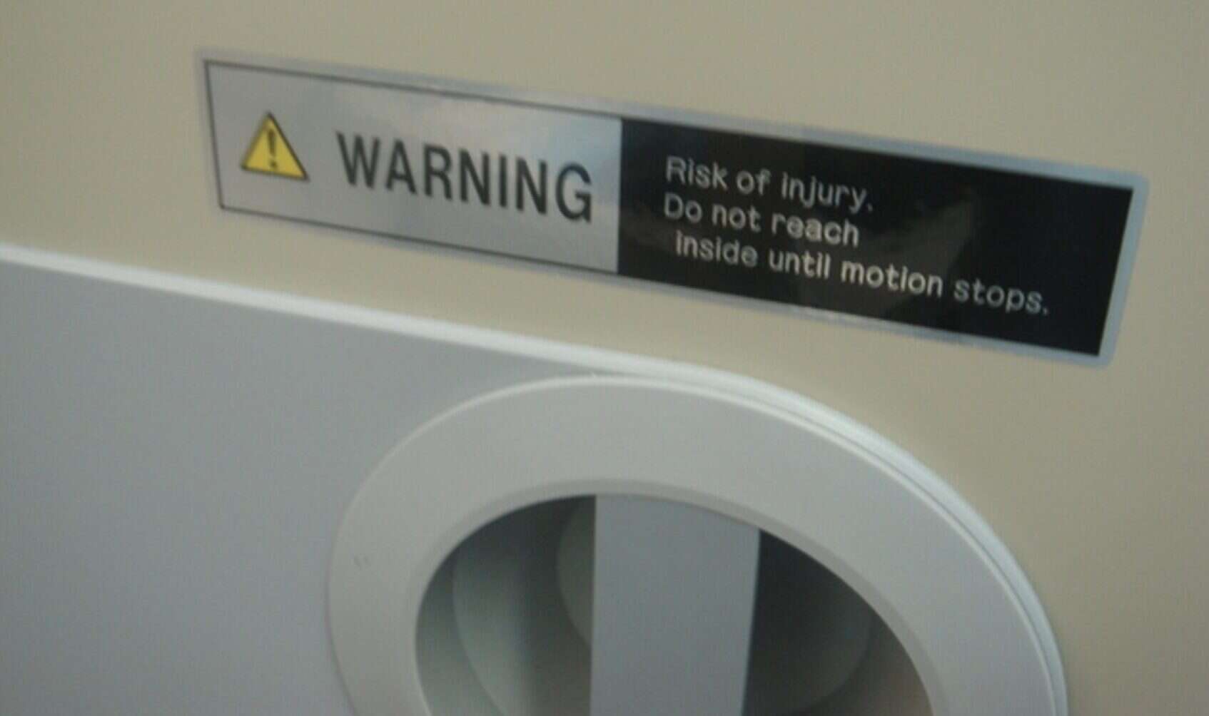 I've collected a lot of sign photos over the years, and hospitals are full of them. A pharmacy robot with multiple warnings about not being inside when the arm is swinging — when lockout/tagout should make it impossible to start the machine with someone inside. A piece of equipment that says “Warning: risk of injury. Do not reach inside until motion stops” — when the machine should lock until it stops.