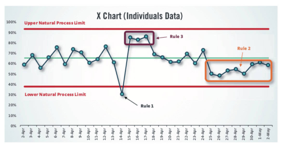 Process Behavior Charts rely on three simple, practical rules to identify statistically meaningful signals. These rules are designed to be visual and usable, not academic.